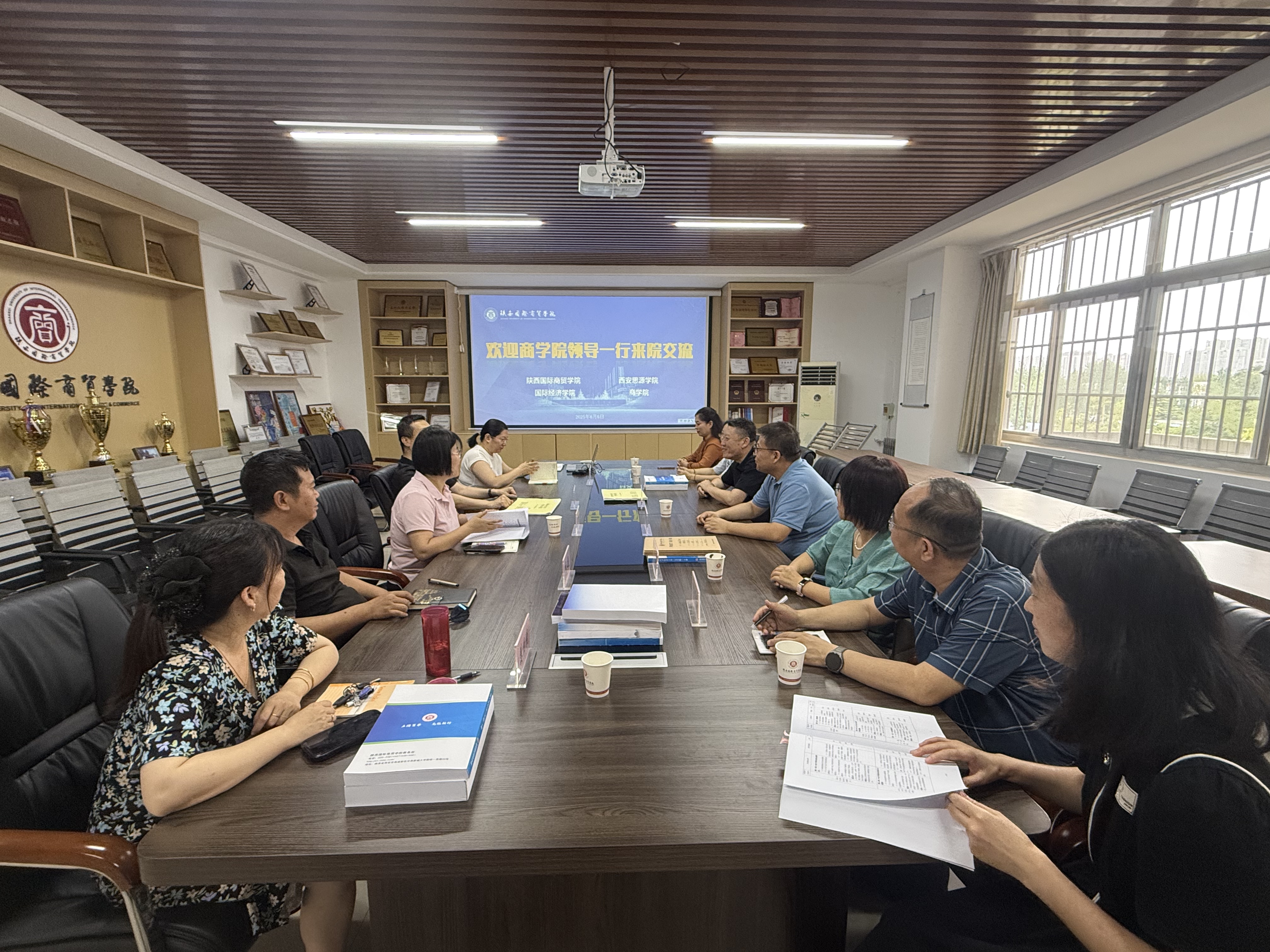 为促进教育资源共享、深化校际合作,6月6日下午由西安思源学院商学院院长李大军教授带队,副院长姜建华、大数据管理与应用专业负责人陈保国、国际经济与贸易专业负责人杨蕾、电子商务专业负责人王锦以及数字经济专业负责人王莉娜来院交流座谈。我院院长冯明、副院长张丽、教研室主任刘志文、李超、姜怡悦参加本次交流座谈。此次交流旨在加强两院之间的交流,共同探讨教育教学改革,推动双方在人才培养、专业建设及科研合作等方面的发展。