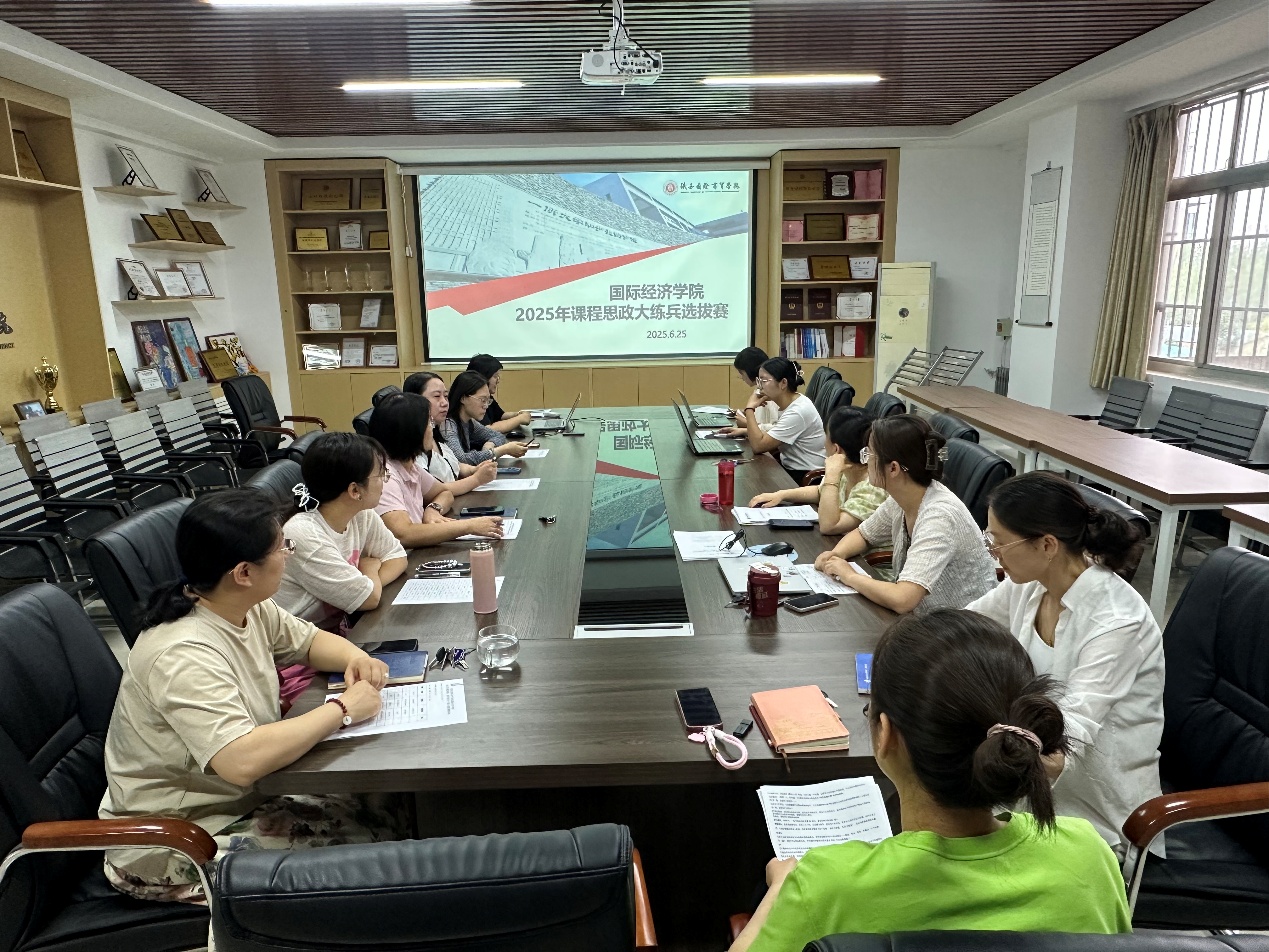 为深入贯彻落实全国高校思想政治工作会议精神,扎实推进课程思政建设,提升教师课程育人能力,国际经济学院于6月25日成功举办2025年思政课、课程思政大练兵院级选拔赛,通过各教研室选拔推荐,共有11名教师参加课程思政大练兵院内赛。学院组织课程思政骨干教师6名作为评委,为院级参赛教师提出宝贵建议,同时帮助推荐校赛的教师二轮打磨项目,助力教师在思政大练兵比赛中获得优异成绩。