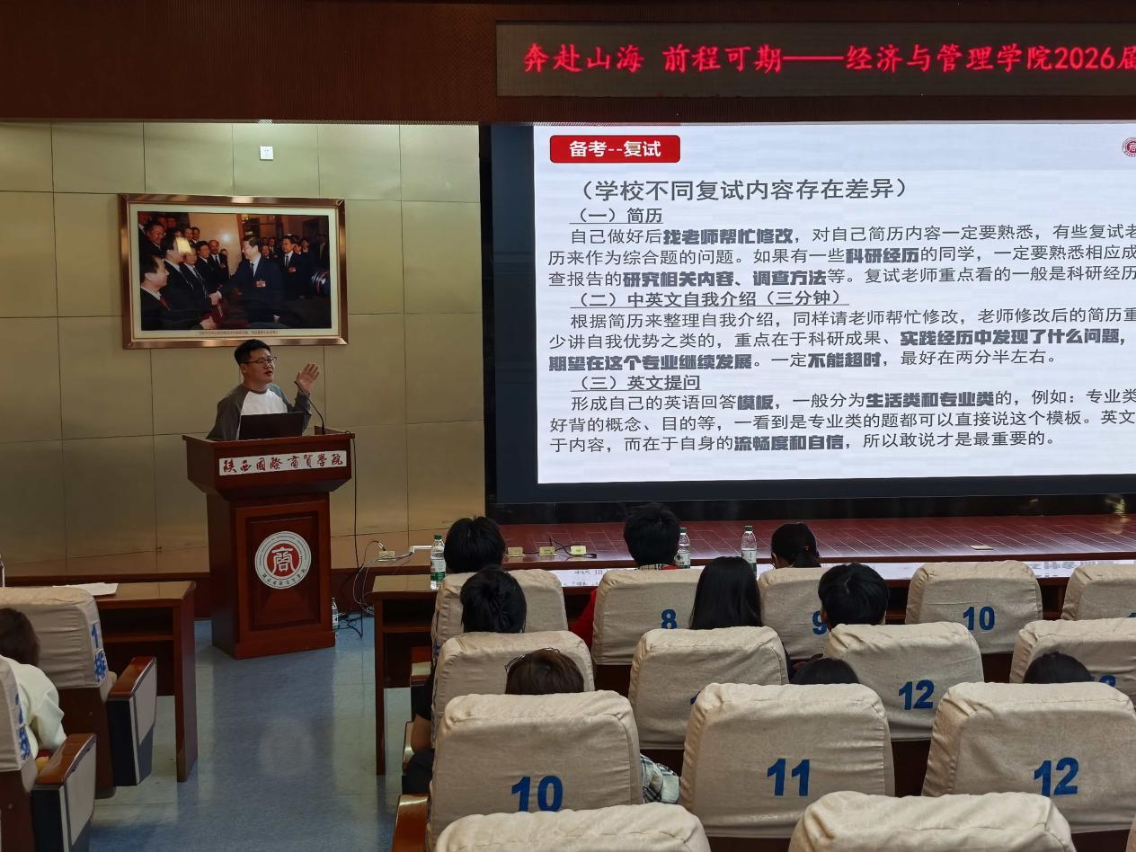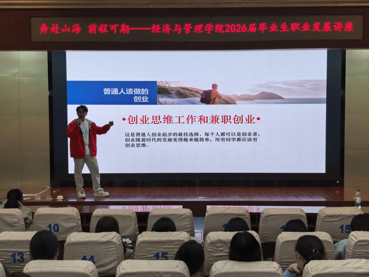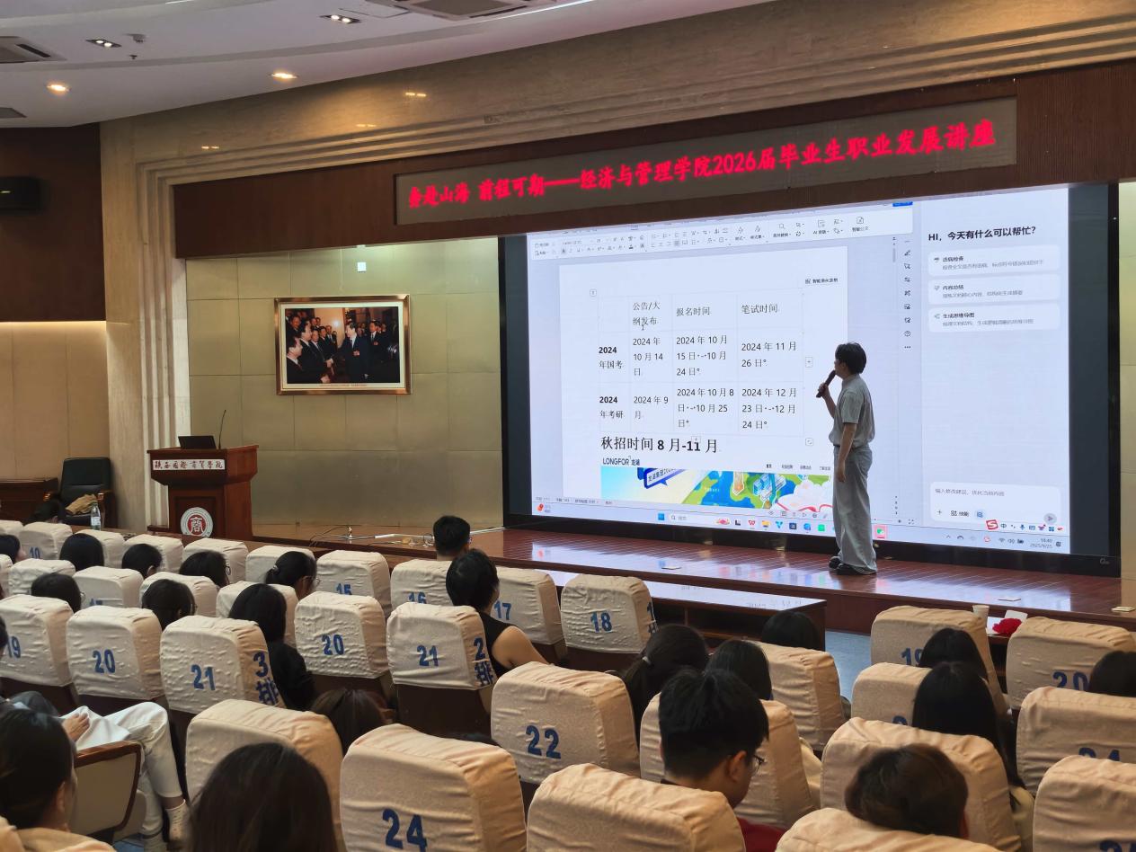 为帮助2026届毕业生明晰未来方向,做好职业规划,提升就业竞争力,2025年9月25日晚,经济与太阳成集团tyc33455cc官网在学术报告厅成功举办了2026届毕业生职业发展导航讲座。本次讲座吸引了来自学院各专业的三百余名大四学生齐聚一堂,现场座无虚席,气氛热烈。