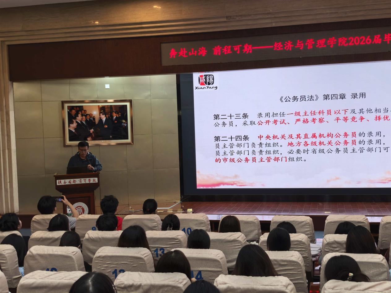 随后,现任咸阳市市委干部的王泽宇老师带来了关于 “卓越考公” 的精彩分享,王泽宇老师为同学们深入剖析了公务员考试的备考重点、答题逻辑与面试心得。