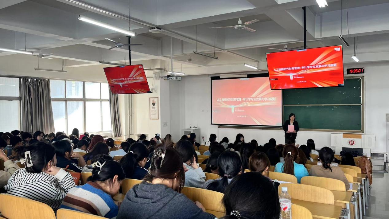 报告伊始,张丽副院长隆重介绍了王放在用友集团智能制造与财务数字化领域的资深背景和项目经验,并代表学院对其表示热烈欢迎。她在致辞中强调,面对人工智能技术的飞速发展,财务管理与审计学专业的学生必须主动适应行业变革,将专业学习与前沿技术相结合,科学规划职业生涯,努力成长为具备数字化思维和实践能力的复合型人才。